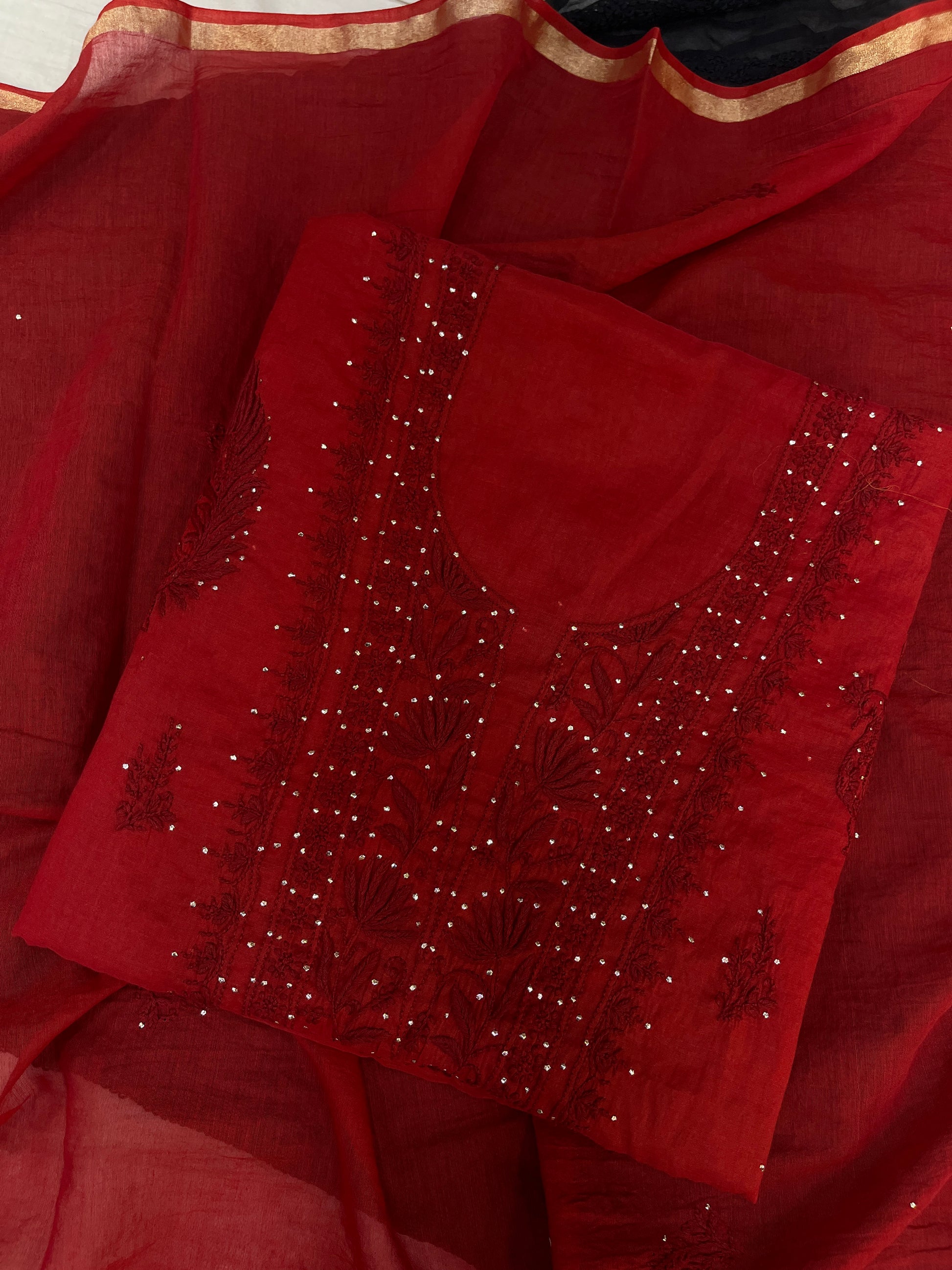 Pure Mul Chanderi Premium Chikankari Mukaish Unstitched Suit Dupatta Set